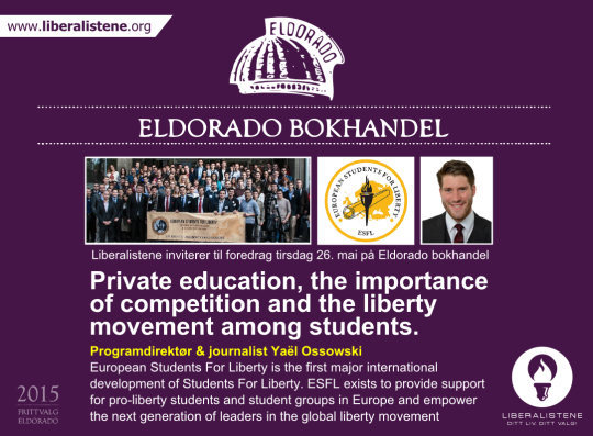 On Tuesday, 26. May, I will be speaking at an event of Liberalistene (The Capitalist Party of Norway) at the Eldorado Bokhandel in central Oslo, Norway.